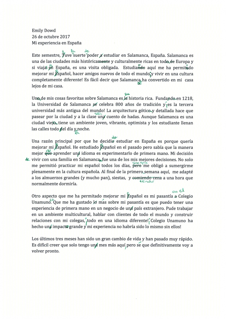 Emily es una de nuestras estudiantes en prácticas. Su nivel actual de español es, más o menos, un A2. Ha escrito la redacción que adjuntamos (corregida). Aunque haya errores de otra naturaleza, vamos a centrarnos en explicar los errores que ha cometido que se corresponden con su nivel.
