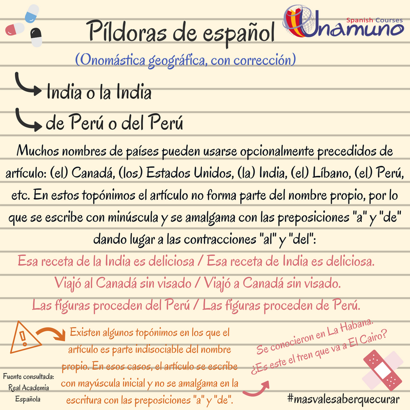 A la hora de presentar los topónimos, solemos subrayar el hecho de que estos no llevan artículo. Sin embargo, no todos los topónimos en realidad van obligatoriamente sin artículo. Esta píldora servirá para nuestros estudiantes como recordatorio de algunos casos particulares. ¡Podemos fijarla a la pared de nuestra aula para que no se olviden nunca!